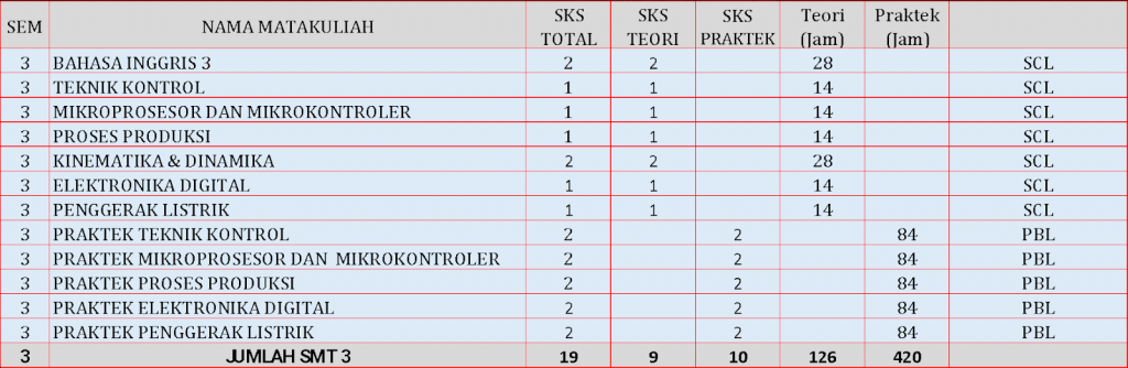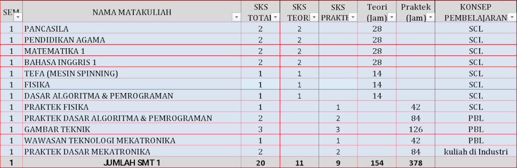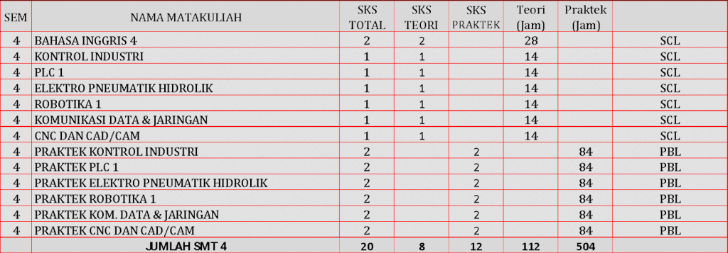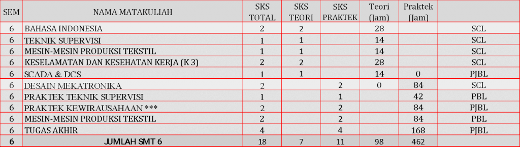 Profil lulusan: Lulusan mampu dan terampil menjalankan/ mengelola, melakukan supervisi, melakukan pengaturan penempatan kerja dan membuat prosedur kerja dibidang mekatronika untuk meningkatkan kualitas dan kuantitas produksi khususnya dalam industri tekstile, dengan menguasai masalah berbasis Pneumatik, Elektronika, Pemrograman, mikrokontroller, CAD / CAM, PLC, dan HMI, SCADA, Internet of Things (IoT), dengan terampil serta dapat melakukan perencanaan perawatan, dan pemeliharaan sistem produksi/manufaktur/industri/ otomasi.