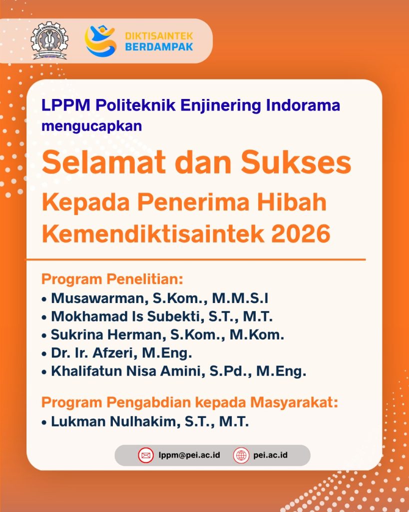 Lembaga Penelitian dan Pengabdian kepada Masyarakat (LPPM) Politeknik Enjinering Indorama menyampaikan apresiasi yang setinggi-tingginya serta ucapan Selamat dan Sukses kepada para dosen yang telah berhasil memperoleh pendanaan Program Hibah Kemendiktisaintek Tahun 2026.